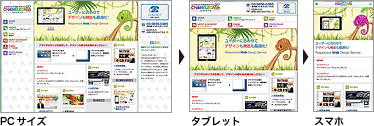 デバイスに合わせたインターフェイスを用意し、例えばPC用にはフラッシュコンテンツを、タブレット用にはフリップによる画像スライド、スマートフォン用には長いページをアコーディオン式に折りたたむ等、各デバイスに合った使いやすいインターフェイスを提供します。