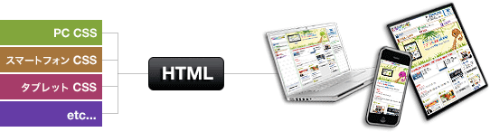 当社が提案するサービスは「Responsive Web Design 標準化」、スマートフォン、タブレット、ノートやデスクトップのPC、大画面のスマートTVまで、様々なデバイスに対して、それぞれ最適化された画面デザインやインターフェイスをワンソースで提供するホームページ制作サービスです。